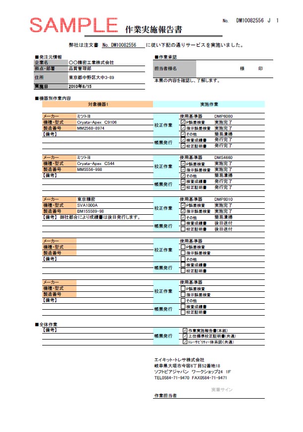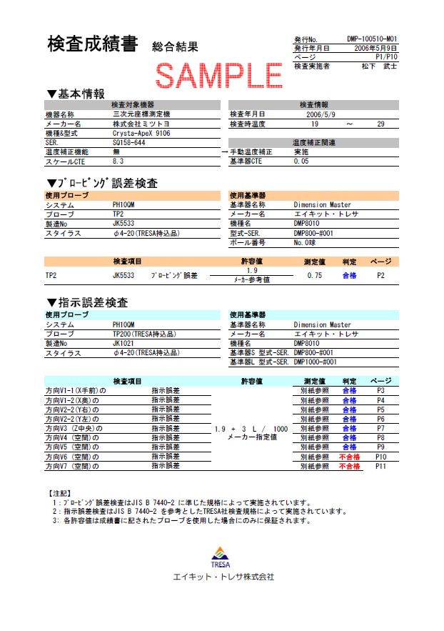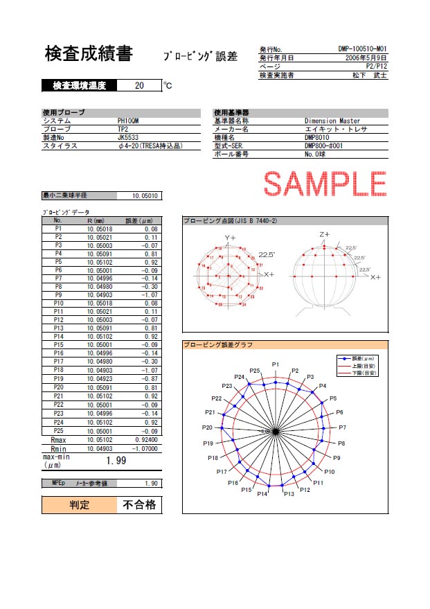 プロービング誤差検査成績書 A4縦/各機で1枚