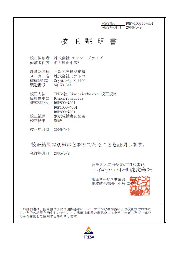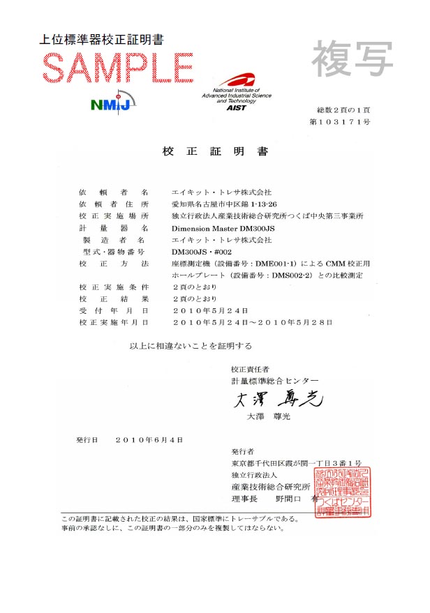 上位標準器校正証明書の写し A4縦/共通で1枚 |